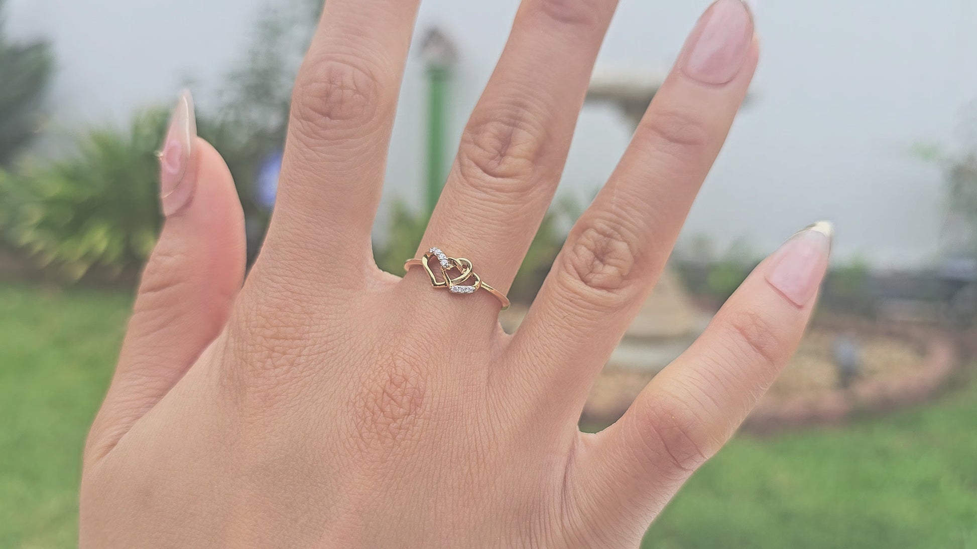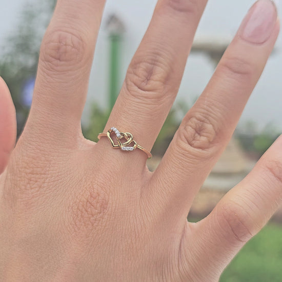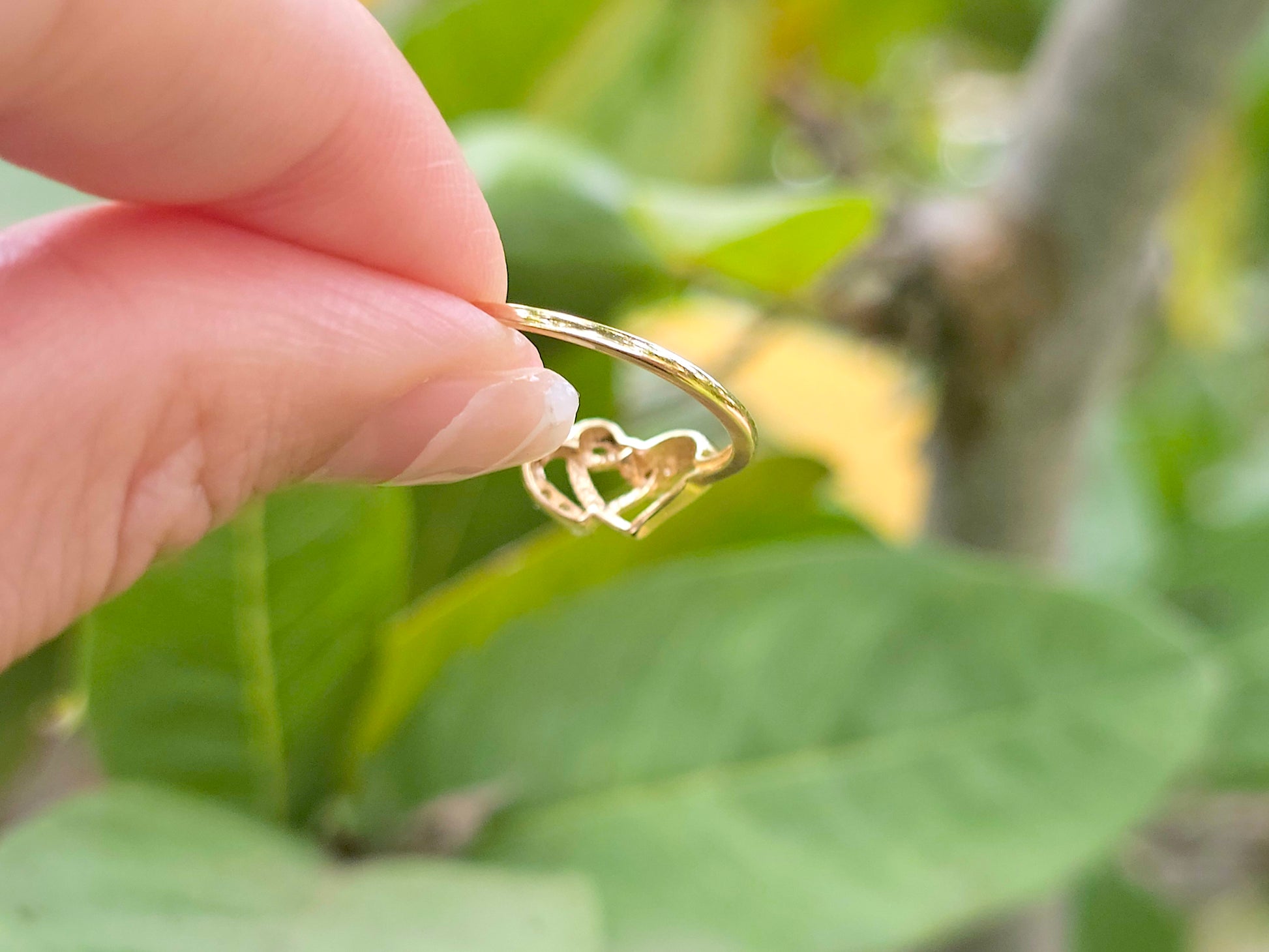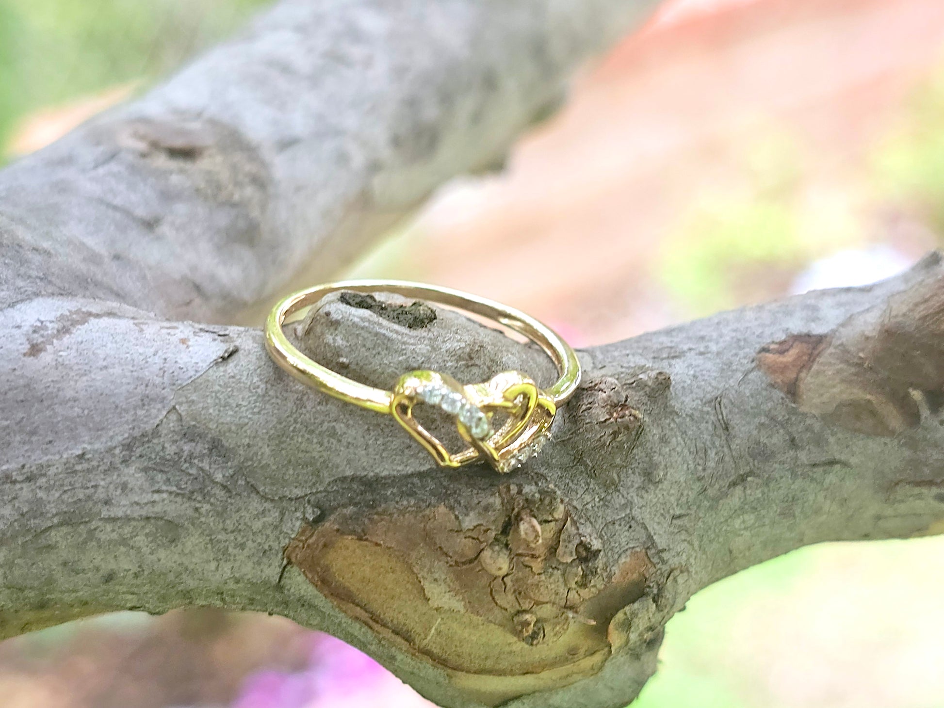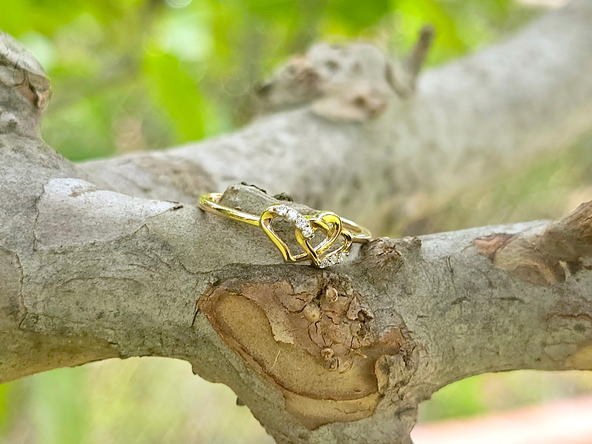 14K Solid Yellow Gold Two Hearts Interlocked Ring Band with CZ Stones